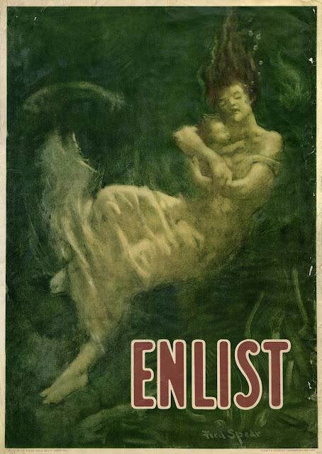 The Us avoided war in 1915 when the Germans briefly suspended further submarine attacks made without prior warning. The harm to Deutschland's reputation was already done equally can be see in the military recruitment affiche which shows a Madonna-like mother and child drowning in the depths of the body of water, victims of a U-Boat set on.